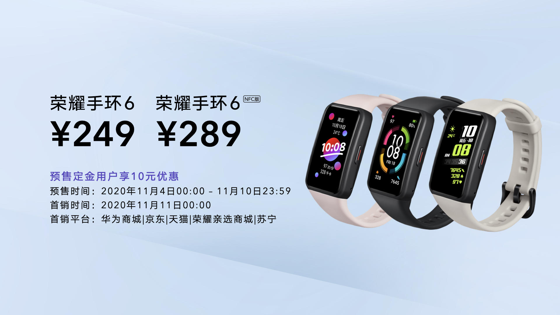 11月3日消息,首款全面屏手环荣耀手环6发布。该手环搭载1.47英寸臻彩大屏,全新升级心率监测技术。通过与301医院合作,接入全国80+家协作医院,提供房颤早搏风险、睡眠呼吸暂停筛查等功能。一旦筛选到健康风险,合作医院将主动跟踪随访;运动模式搭配14天长续航。标准版售价249元,NFC版售价289元,11月4日0点全平台开启预售,11月11日0点正式开售。