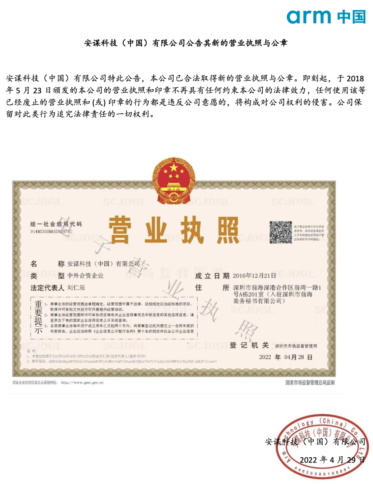 安谋中国公告其新的营业执照与公章