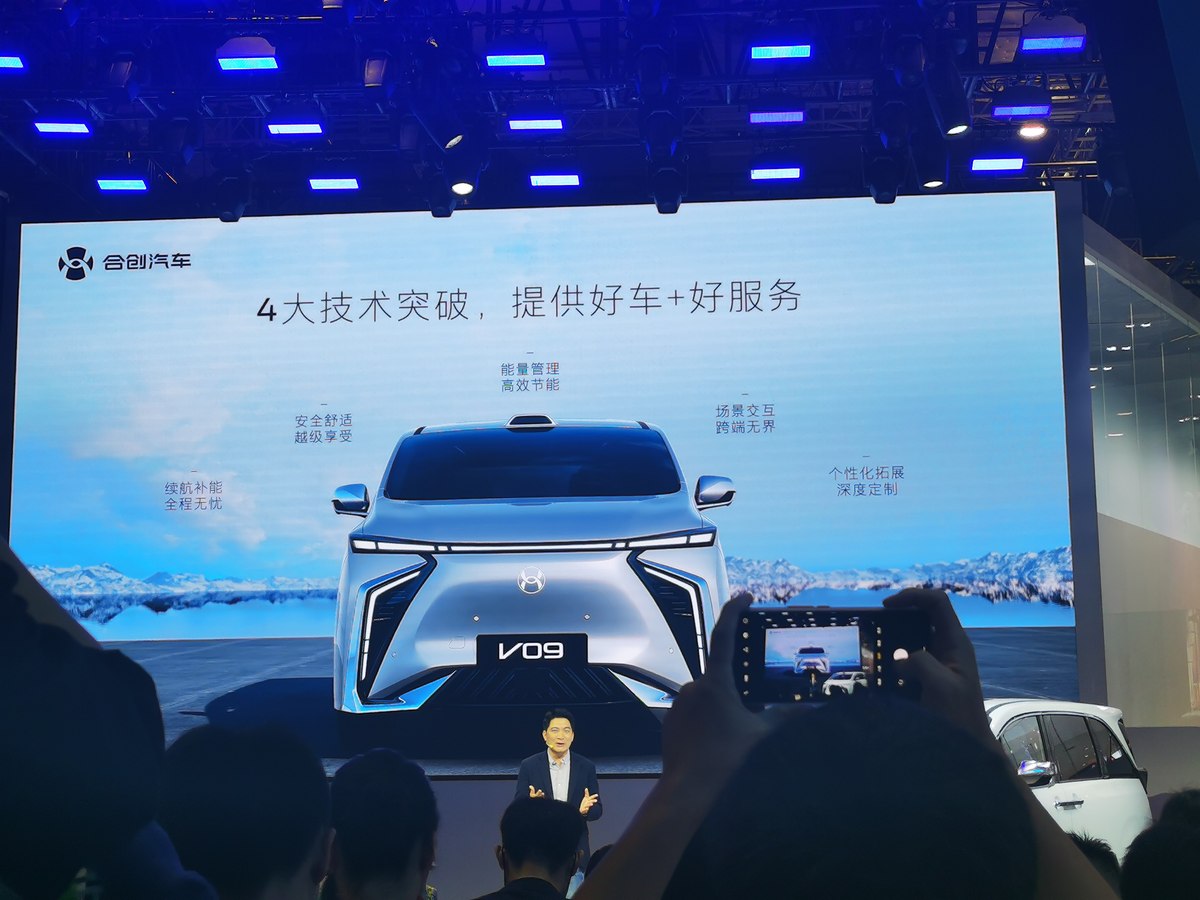 车东西4月18日上海车展现场报道,本次合创汽车在上海车展展示了V09。
