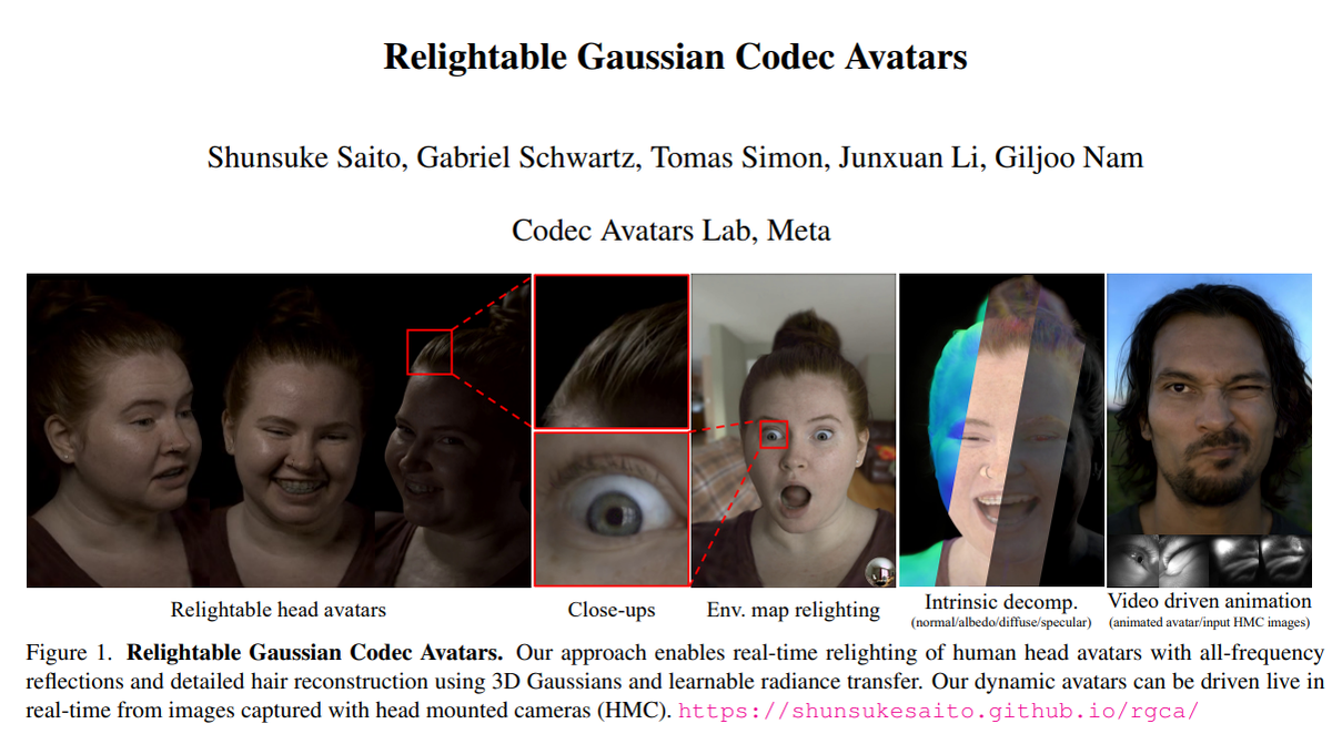 智东西12月8日消息,当地时间12月6日,来自Meta的研究团队发布了可重新照明的高斯编码头像(Relightable Gaussian Codec Avatars),是之前的编码头像2.0(Codec Avatars 2.0)的升级版。这是一种构建高保真可重新发光头部头像的方法,可以通过动画来生成新颖的表情,并在点光源和连续光源下高效地实时重照明。该方法基于3D高斯的几何模型,可以捕捉3D一致的亚毫米级细节,如动态面部序列上的发丝和毛孔。作者还在消费级VR头显上演示了虚拟形象的实时重照,展示了效率和保真度。