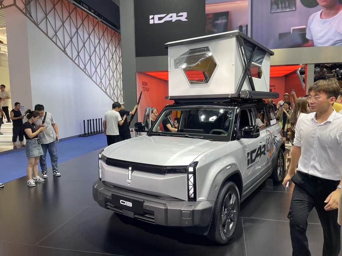 iCAR 03T采用个性造型方案,以更为激进的侧包围、贯穿式进气口等机能元素,全系标配19寸轮毂,离地间隙最大可达 225mm。