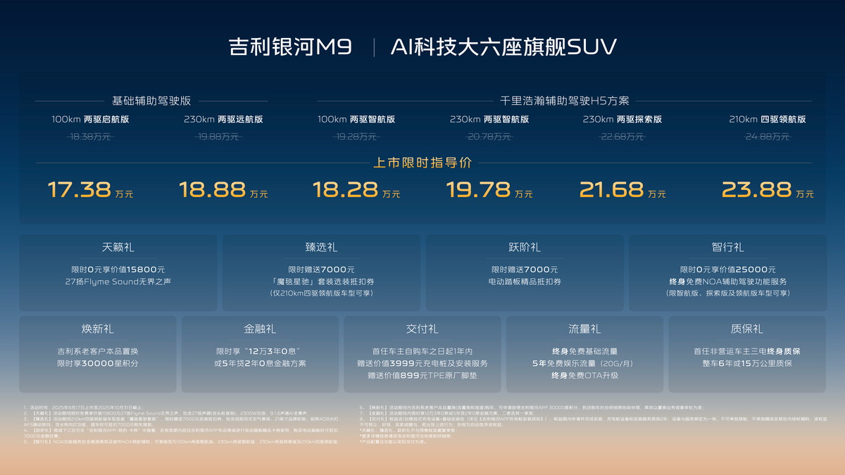 9月17日,吉利汽车在杭州正式发布旗下全新大六座SUV——银河M9,定位AI科技旗舰车型,共推出6款配置版本,上市限时指导价17.38万-23.88万元。新车基于吉利全域AI技术体系开发,主打智能座舱、高阶辅助驾驶及大空间家用场景,并搭载行业领先的AI数字底盘和神盾电池安全系统。