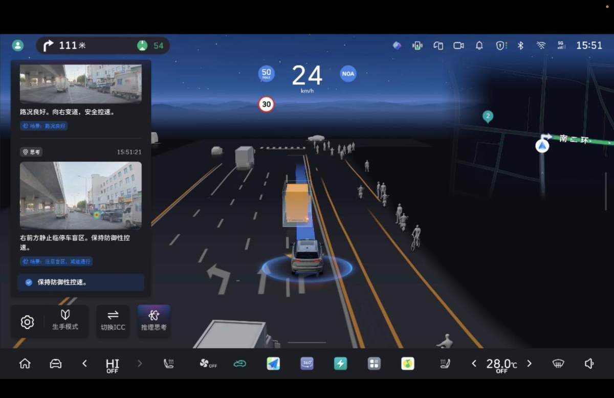 此外,系统支持在辅助驾驶过程中通过自然语言指令进行交互,例如“帮我起步”“远离大车”等,但出于安全考虑,语音控车权限仍限于驾驶员。另一显著特点是系统在中控屏提供了可视化的CoT(思维链)信息卡片,实时显示感知、推理、决策与执行过程,尝试打破辅助驾驶的“黑盒”状态,提升用户对系统行为的理解与信任。