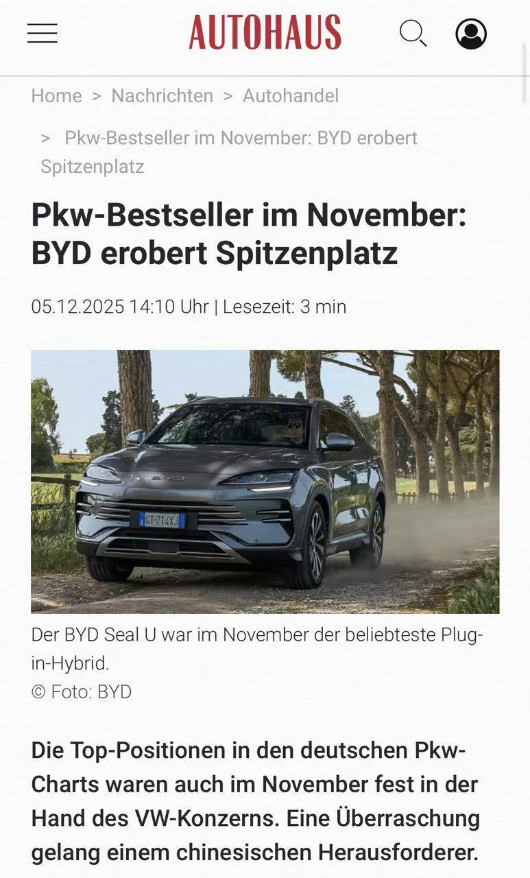 车东西12月11日消息,日前,BYD SEAL U(宋PLUS)成为德国11月车市插混车型销量冠军,欧洲市场格局正被重塑,引发行业广泛关注。这不仅是中国汽车品牌首次在德国主流细分市场登顶,更意味着比亚迪在欧洲的规模化突破已进入全新阶段。