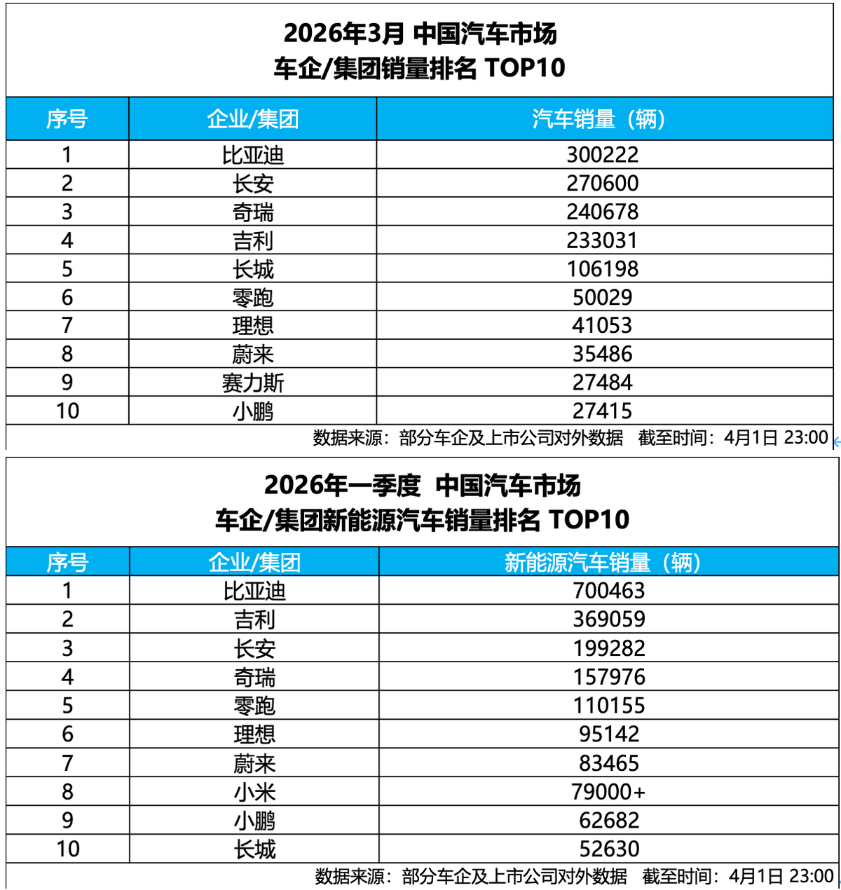 车东西4月3日消息,日前,比亚迪发布 2026 年 3 月产销数据,单月总销量达300222 辆,强势突破 30 万辆大关,斩获中国车企销量冠军,并连续 58 个月蝉联中国新能源汽车销量冠军,持续稳固行业龙头地位。截至目前,比亚迪新能源汽车累计销量已超1580 万辆,一季度累计销售 700463 辆,以硬核数据印证技术与规模双重实力,用技术创新持续引领行业向上。