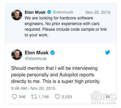 事实上,马斯克在2015年就感受到了特斯拉可能会面临的自动驾驶,当年主动发推文,先行大力招募自动驾驶的软件人才,而后对AMD、英特尔、苹果等公司的硬件人才挖角行动也没有停过。