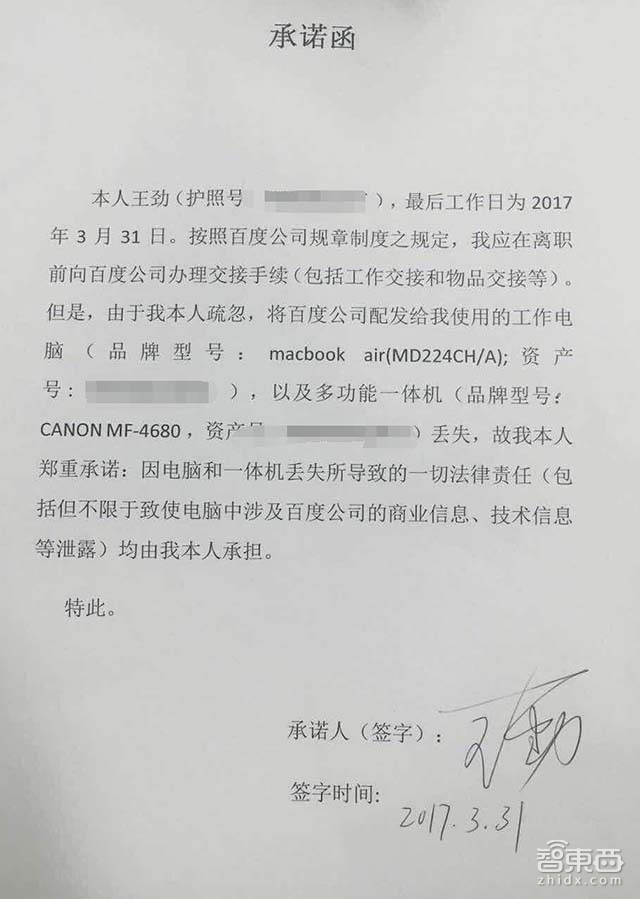在离职时,百度方面要求王劲签署了一份承诺函(如下图),即承担由电脑和打印机丢失造成的一切法律责任。