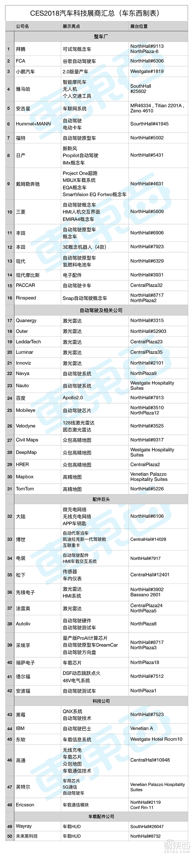 为了让大家的观展更加高效,车东西从这529家展商中选出了最重要的50家公司制作了下表,主要涉及整车厂、汽车配件商、科技司,以及创业公司四大类别。