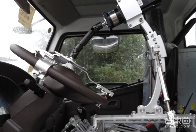 从外观上来说,这套驾驶机器人并不像“人”,而是一个机械臂类的控制器,能够控制车辆的方向盘、刹车/油门、以及档位(自动挡汽车的PRND等档位),再结合着感知与决策模块,这个“驾驶机器人”就能自己开车行驶了。