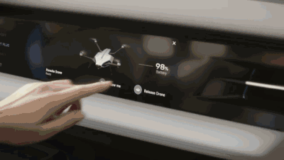 使用前,需要先将无人机的信号中继器通过USB与汽车连在一起,然后车机屏幕上就会显示出无人机控制界面,把无人车放在车顶,点下起飞按钮后无人机就会升空,并将无人机摄像头拍摄的换面传回车载屏幕。