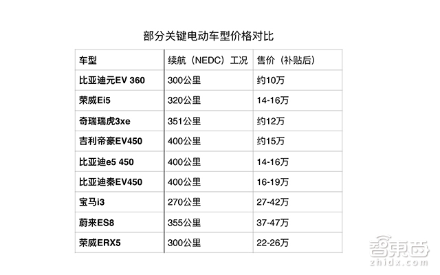 在这个队列中,既有国际车厂的宝马i3、大众e-golf,合资品牌的腾势 400、之诺1E,又有自主品牌的荣威ERX5,还有新造车的蔚来ES 8、小鹏G3。以其中最贵的ES 8为例,同样是350公里的续航,用户将会付出3倍(ES 8创始版补贴后 47万左右)于比亚迪e5 450的价格。