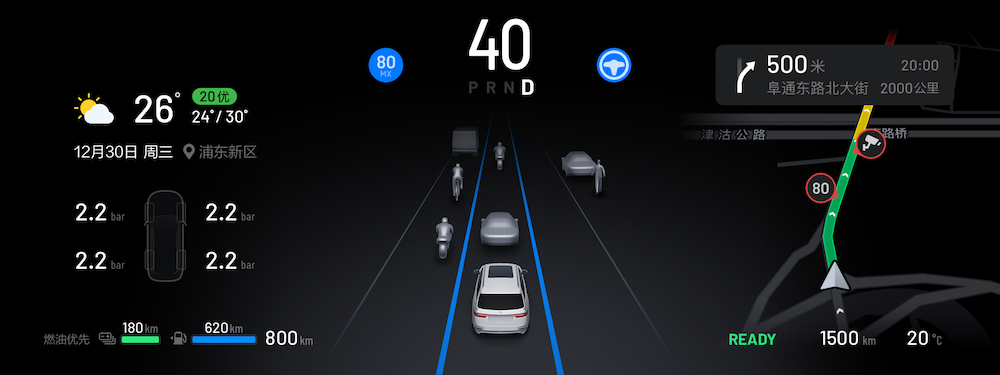 在界面设计上,理想OTA 2.0也有不少更新,仪表显示屏增加了胎压、天气、后排状态等信息卡片,也更新了地图卡片的设计,地图显示更大,同时卡片可以自由定义和切换。