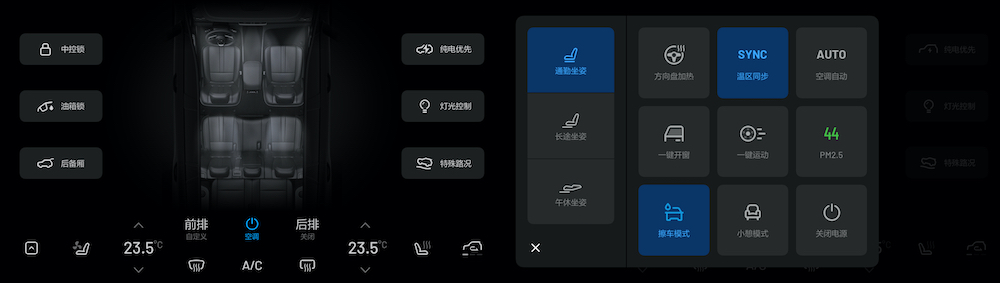 车辆控制屏幕新增了自定义快捷面板功能,在屏幕左下角就能启动操作界面,快速调整车内设置。同时,车辆控制屏幕的设置也会实时显示在仪表屏幕上,驾驶员不用分心就能方便地操控。