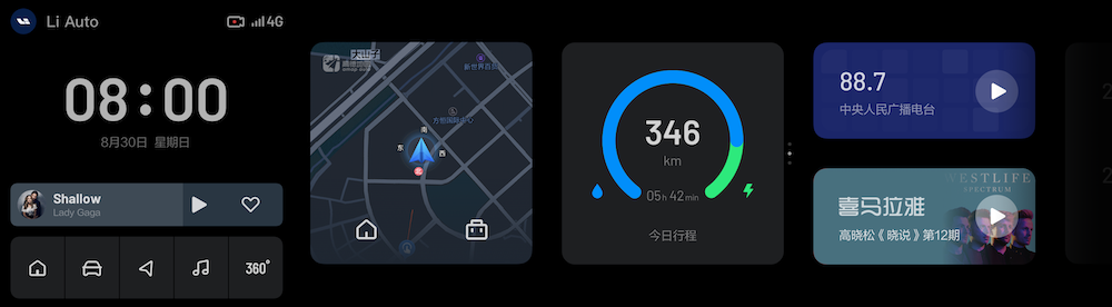 中控屏幕的卡片风格更加简洁,卡片可以滑动切换,此前屏幕左侧的应用快捷入口现在统一排列在左侧下方,更加方便用户操作。副驾娱乐屏幕的界面重新设计,和中控屏幕统一风格。