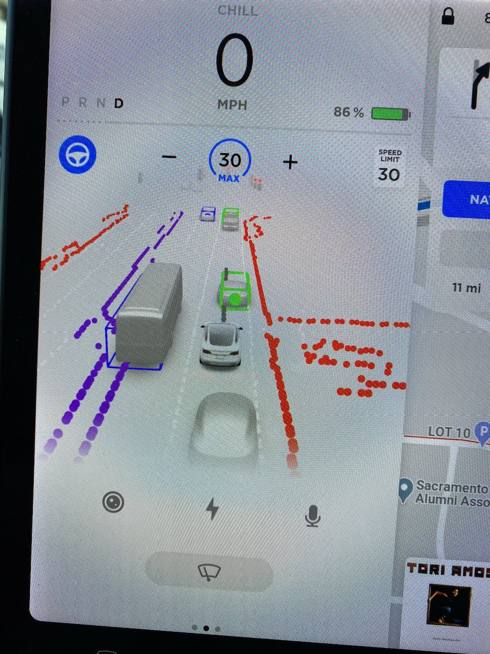 周围车辆和障碍物的显示也有不同,如果是路边停止的车辆或障碍物也使用红色方框标记,代表不能通过,正在行驶的车辆根据距离远近分别用白色、绿色、黄色、蓝色、红色方框标记。足够详细的信息标记让特斯拉能够对周围的路况有更详细的了解,提升自动驾驶的安全性。