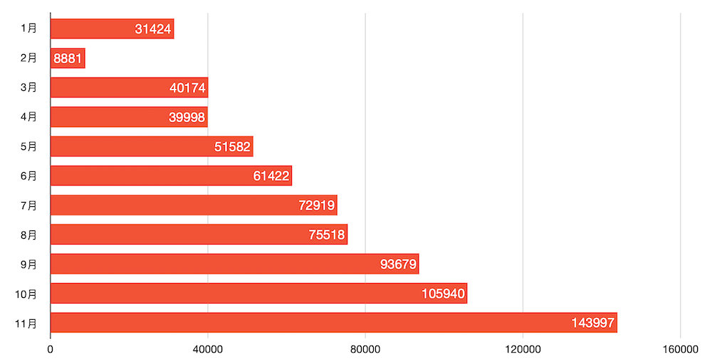 1、从年初至今,整个纯电市场从月销数万辆,逐渐增至11月份的14.4万辆,纯电这块“蛋糕”扩大了一倍还多。
