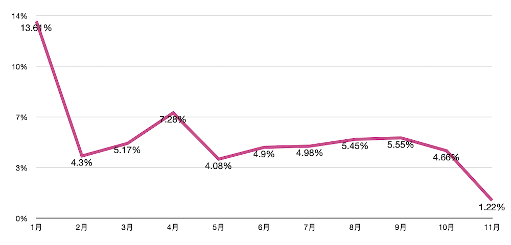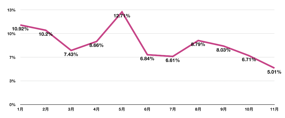造车新势力的销量也是一路高歌猛涨,蔚来11月销量达到5291辆,小鹏达到4224辆,都创下新高。整体来看,1月~11月蔚来汽车的市场占有率为5.0%,从11个月的市占率变化来看,蔚来汽车的波动也不明显,整体趋于稳定。