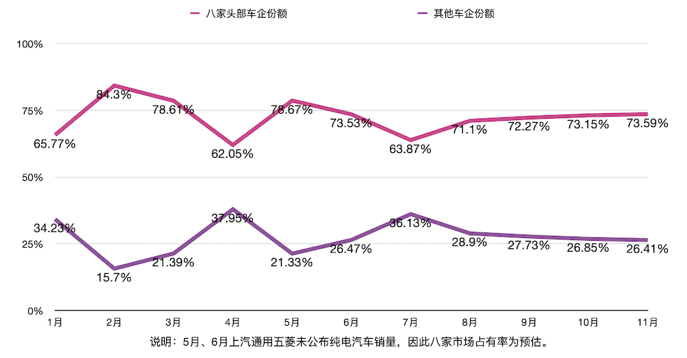特斯市场占有率达到15.9%,上汽通用五菱、比亚迪、广汽埃安、长城、北汽新能源几家传统车企的市场占有率达到47.1%,蔚来、小鹏两家造车新势力的头部车企市场占有率达到8%。整体来看,纯电市场的这八家车企占据整个市场71%的份额。今年11月,八家车企的市占率已经达到73.6%,正逐步逼近3/4的市占率。