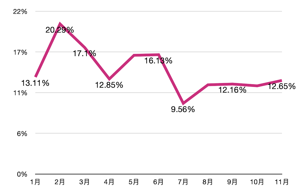 今年3月起,纯电汽车市场的销量出现了明显上升。除4月以外,纯电汽车销量环比都处于上升状态。9月以来,纯电汽车销量环比涨幅一直保持在10%以上,11月达到26.4%,也创下除3月以外最大单月涨幅。