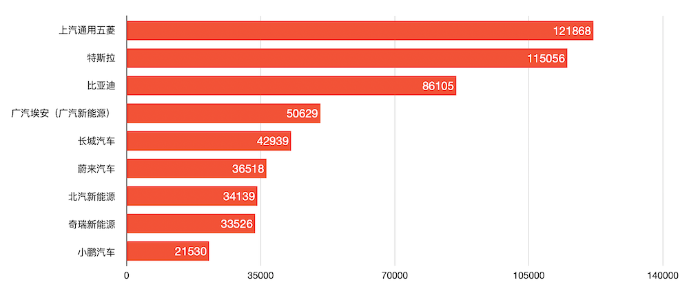 特斯拉总销量紧随上汽通用五菱之后,销量也达到11.5万辆。比亚迪销量8.6万辆销量排名第三,广汽埃安以5.1万辆销量排名第四。