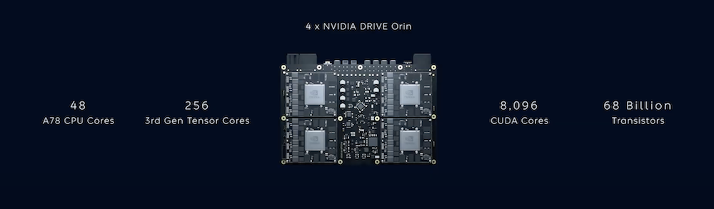 蔚来ET7的Adam自动驾驶电脑采用4颗英伟达Orin SoC,单颗芯片的理论算力可以达到254TOPS。实际运行中,两颗Orin SoC参与计算,每秒钟能处理传感器产生的8GB数据。第三颗Orin SoC作为冗余,随时备用。第四颗Orin SoC则进行本地化的机器学习,不断提升车辆的自动驾驶性能,同时根据驾驶员个人喜好提供个性化的驾驶体验。