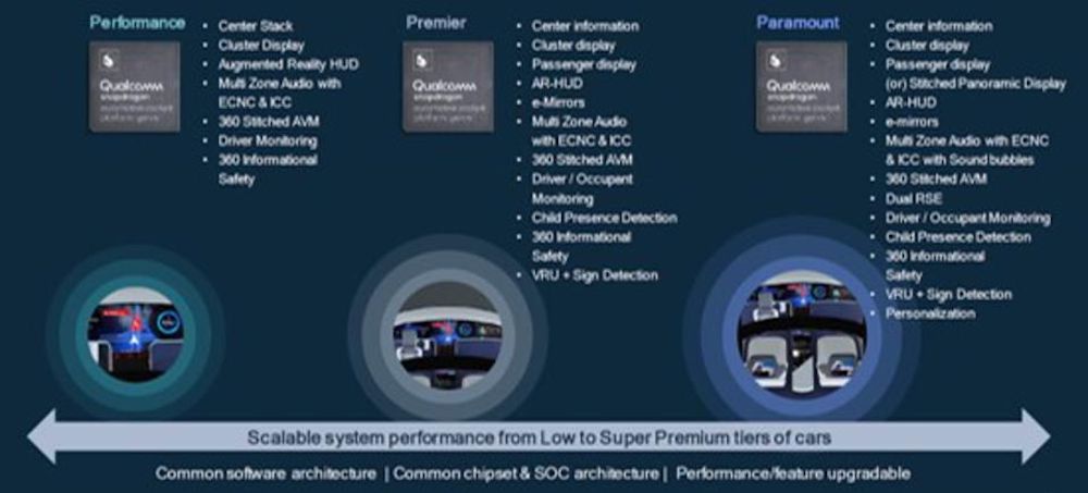 该平台的核心是一颗SoC,内部整合了第6代高通Kryo CPU、多核高通AI引擎、第6代高通Adreno GPU等核心,整体配置对标旗舰手机SoC骁龙888,可在车内支持多块高清屏幕。内置的AI引擎支持多音区语音交互、驾驶员监测等AI应用,并且支持高通5G和5G C-V2X网络连接。