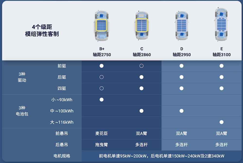 D级车轴距为2950mm,有前、后、全轮驱动三种模式可选,电池包容量为100kWh,前、后悬架也分别为双A臂和多连杆。