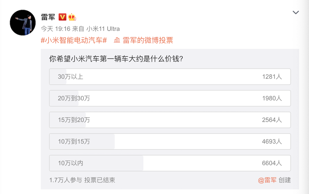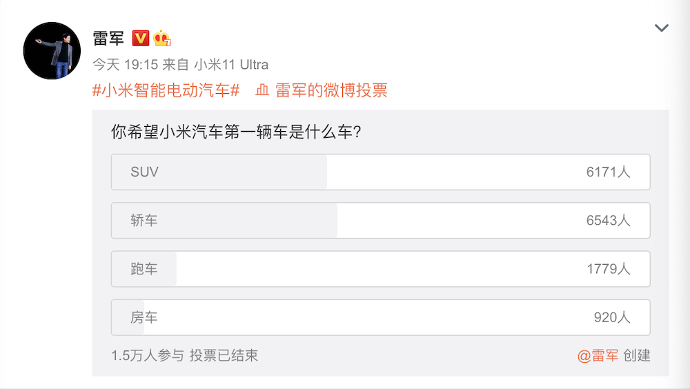 直播开始前,雷军还在个人微博发起投票,就小米造车的品牌、价格区间以及车型征求网友意见。