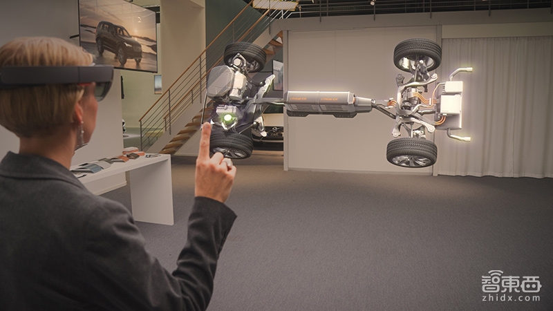 这样带来的视觉冲击力是很大的,眼前舞台上出现了一台1:1大小的汽车底盘,不过你佩戴HoloLens的角度需要对好这个舞台。可以这样比喻,好比现在演示的虚拟3D汽车画面是固定在舞台上的,而你和HoloLens眼镜则是相对移动的,如果角度不对,眼前的汽车就会移出眼前的显示画面,也就是开篇提到的长方形显示区域,这时候就会让你感受到,眼前的演示仍然是来自一个眼罩上几英寸大的画面。