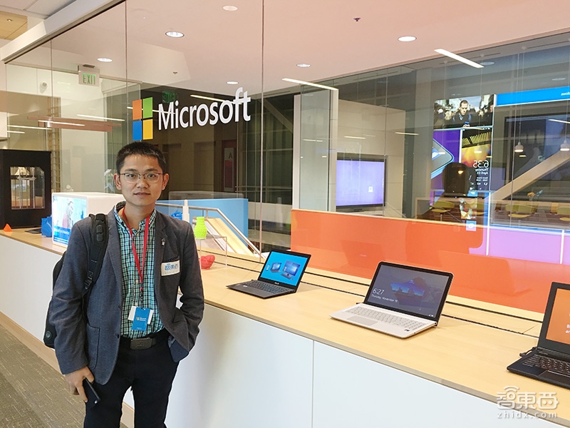 这是一个小范围的媒体活动,全球媒体总计在10家左右,主要是连线、纽约时报等。微软总部的这个专门设立了演示厅的大楼也是一个对外的公共展厅,展示了使用微软Windows系统的PC和智能手机等产品,装修风格同望京的微软大厦相比有熟悉的感觉。