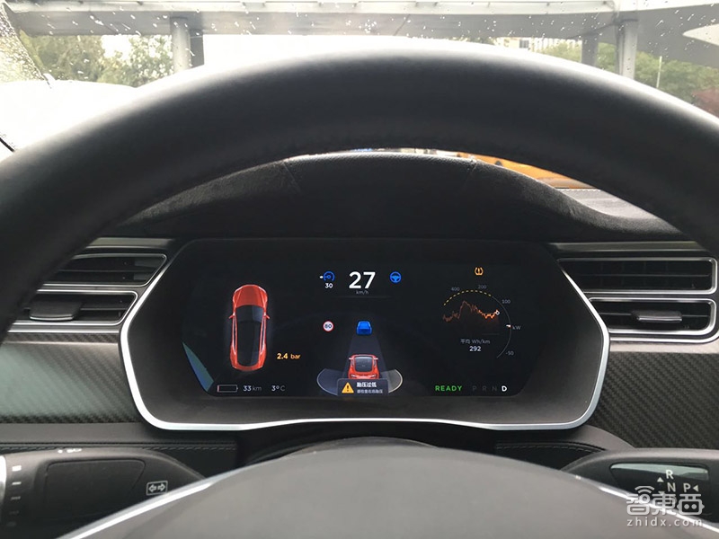 按照特斯拉Auto功能的设定,在时速30公里/小时以上时,自适应巡航和自动转向的指示灯才会亮起,这时通过方向盘左侧转向拨杆下方的小拨杆往外台2次,分别开启自适应巡航和自动转向功能。