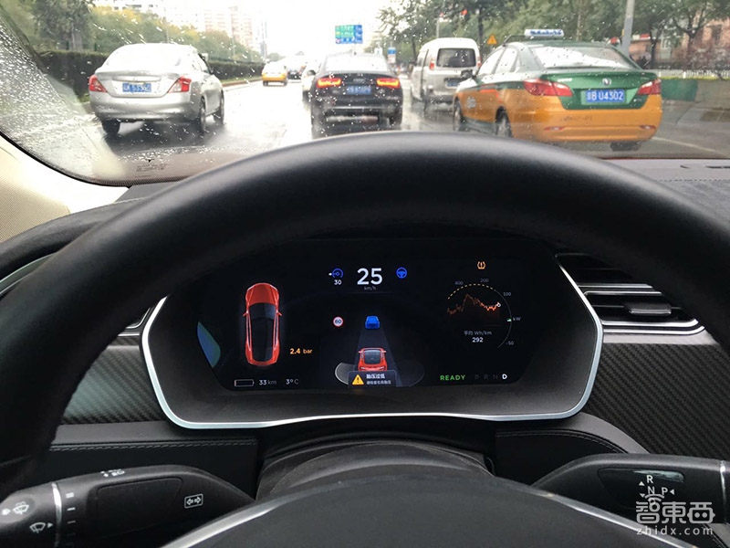 不过也有另一种情况,在慢速跟车的时候,有时候自适应巡航和自动转向功能也能打开,这样,跟车行进的时候,如果距离前车过近,特斯拉会自动刹停,可理解为一些自动巡航车型中所说的“蠕行”跟随的感觉。