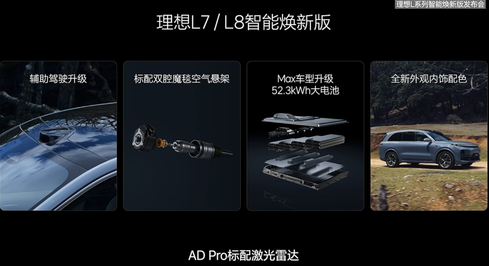 除了芯片升级,理想L6、L7、L8、L9智能焕新版还实现了激光雷达全标配。