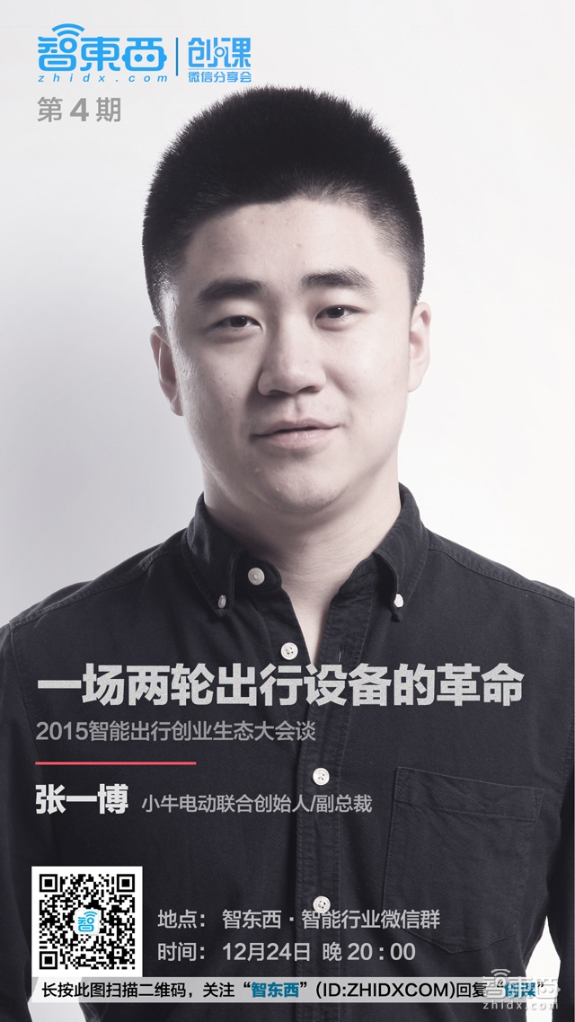 第四期创课请到的分享嘉宾是小牛电动联合创始人/副总裁张一博,他将带来关于2015年智能出行创业领域的行业解读和创业经验分享。