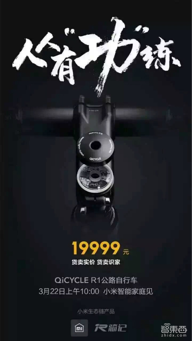 智东西3月17日消息,今天小米智能家庭官方微博发布了一张海报,宣布它们将在3月22日发布QiCYCLE R1公路车。售价 3000 美元(折合人民币约 19495 元)!创小米单品史上最高价!
