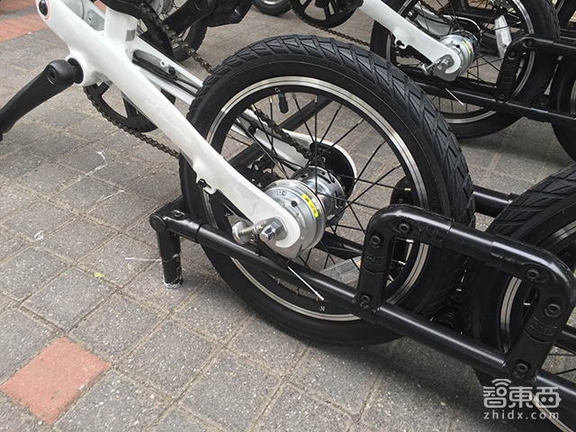 基本设计方面采用了Shimano的三速内变速套件,一体主梁、折叠车架。相比其它助力类电动车产品,骑记这款产品有两个挺大的不同,一是将电机装在前轮、二是电池组放在了主梁里面,可以从尾灯的位置抽出来。