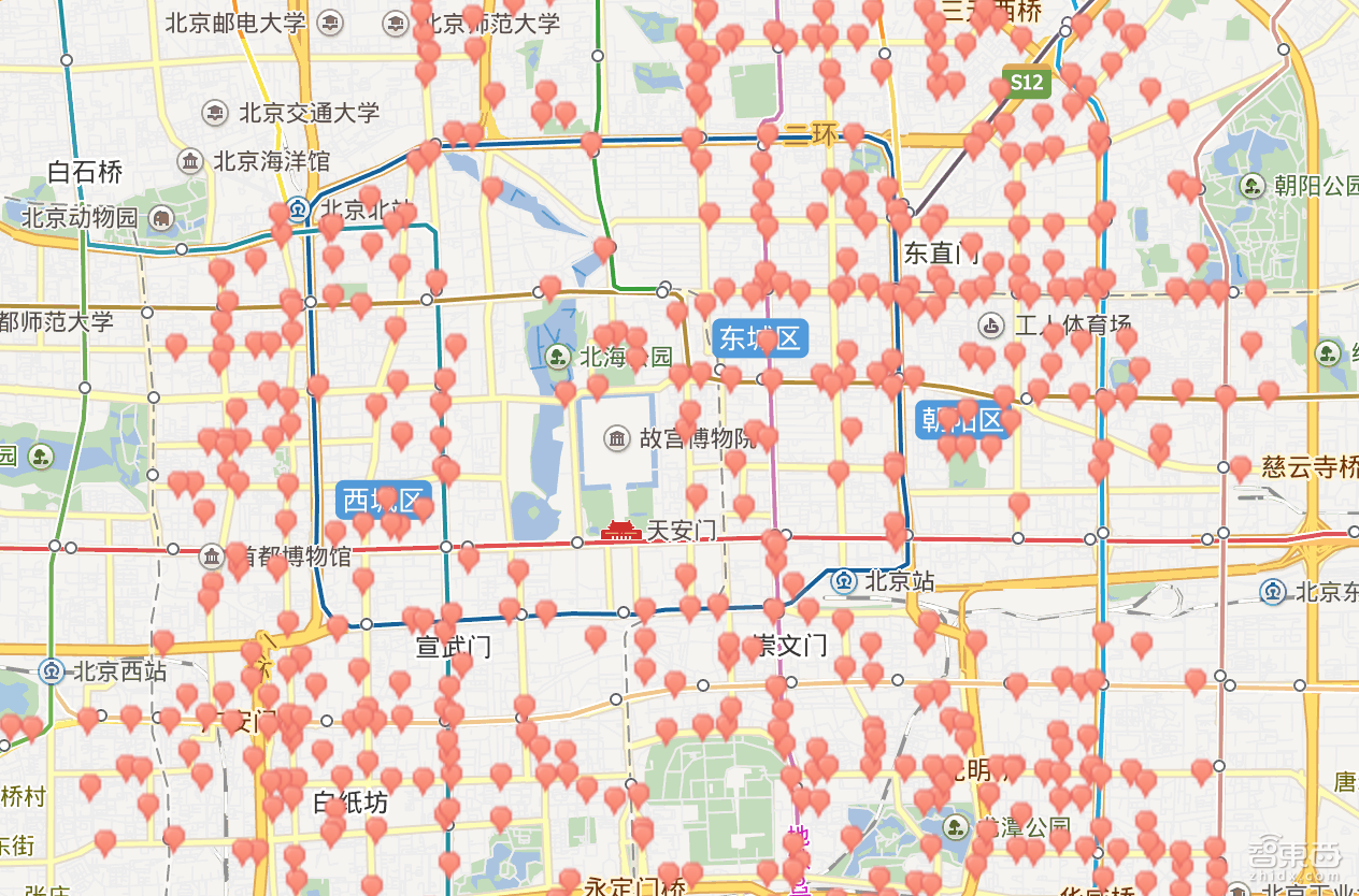 朝阳区的自行车网点最密集,从图上来看,不出200米就有一个,这与摩拜单车想要达到的每100米有一辆车的目标相差不远。