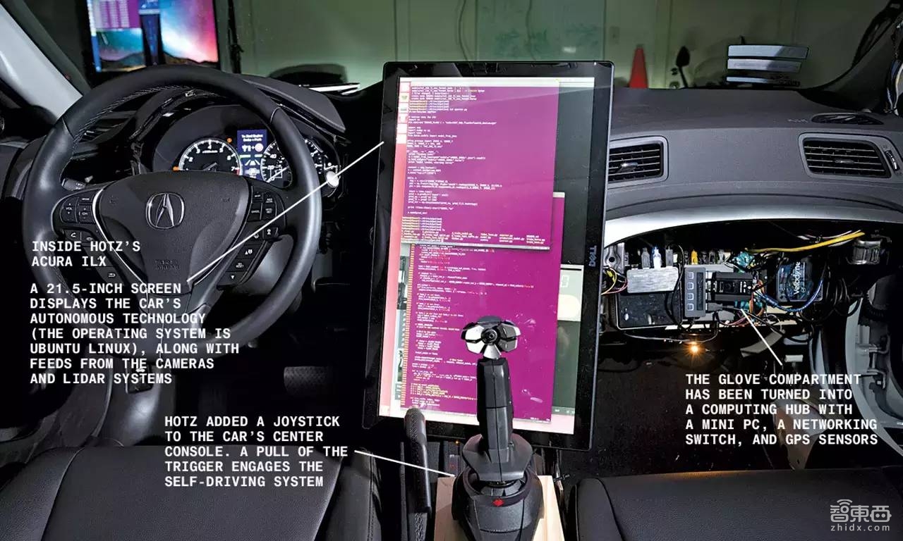 2015年乔治·霍兹再次走进公众视野,引起关注,是因为其憋在车库捣鼓2个月,靠一己之力开发出一套自动驾驶系统,并按这台2016 款讴歌ILX可以上路自动驾驶,不过这次并没有像当年他18的时候出售iPhone破解代码换取一辆新车,已经26岁的乔治·霍兹要用这个项目去争取投资、商业化。