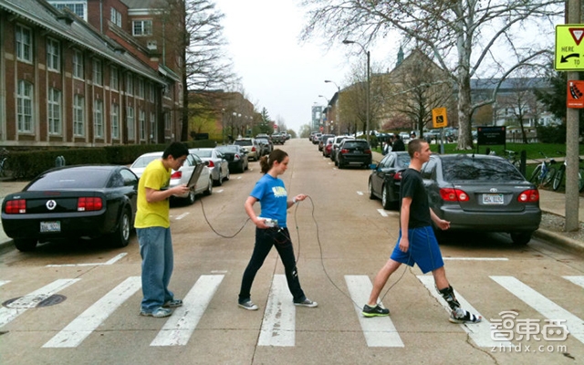 李一帆的研究方向是智能穿戴机器人的控制识别系统,说的具体点就是写一套算法来分析外骨骼上各个传感器的的数据,从而判定使用者是走路、跑步还是上楼。在测试期间,李一帆都是像上图这样无比猥琐地抱着笔记本跟在测试者的身后摆弄电脑,并且中间还需要另外一名同学帮他拎着数据线。