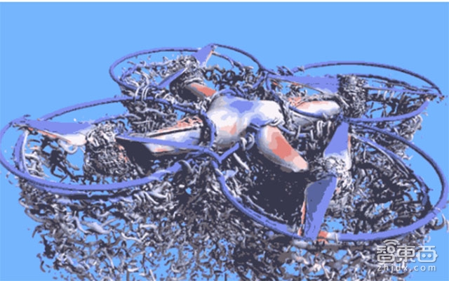 该动画还表现出无人机如何产生各种噪音。 看到那些由锋利的机翼叶片产生的低压蓝色圆圈了吗? 其实,最终旋转机翼通过这圆圈切转回来,气流彼此造成干扰,因而使得无人机是如此的嘈杂。 在这一的动画的帮助下,设计师可能会找到重新设计无人机的方法。