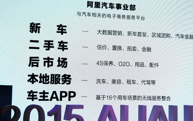 2015年4月,在原有淘宝汽车、天猫汽车团队的基础之上,阿里整合汽车相关业务,成立了汽车事业部,设有整车与二手车、O2O、汽车用品、APP以及营销共5个团队。从其团队构成上来看,阿里抛弃了之前仅仅在淘宝、天猫上销售新车与汽车用品的做法,开始采用O2O平台的模式,将车主、线下店、零配件、装饰用品整合在一个平台上,让用户在一个APP上即可完成,车辆购买、金融贷款、维修保养、美容装饰、车辆抵押、二手车销售以及租赁代驾等涉及16个场景的全方位O2O服务。