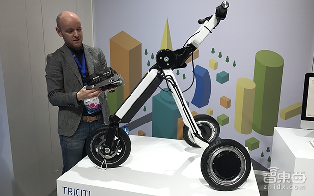另外一个实物产品是可折叠变形的Triciti两轮电动车。该电动车也是为了解决最后一公里的载人/载货需求。通过座椅与车轮位置的变化,该车能够变成一个电动车或是电动手推车。