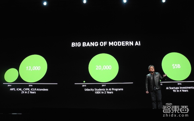 老黄先是介绍了深度学习算法从2012年以来,推动人工智能爆发式增长。自2012年以来,人工智能界里一个突破紧接着另一个突破,在图像识别、自动驾驶、语音识别、翻译等领域取得了突出成就。人类已经成功地让机器识别出物体、人脸,进而让机器解图像/视频内容、随后增强学习带来了AlphaGo、以及发展中的无监督学习、对抗神经网络等等。