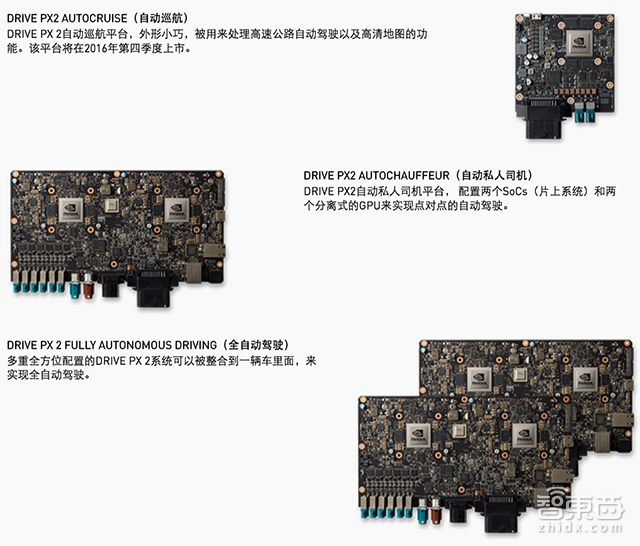 包括Drive PX2 AutoCruise、Drive PX2 Chauffeur、Drive PX2 Autonomous Driving三个产品。按照功能来说,三者依次是为了实现L2/L3级别的自动驾驶(自适应巡航或高速公路自动驾驶)、L3/L4级别的自动驾驶(点对点)以及L4/L5级别的完全自动驾驶来设计的。