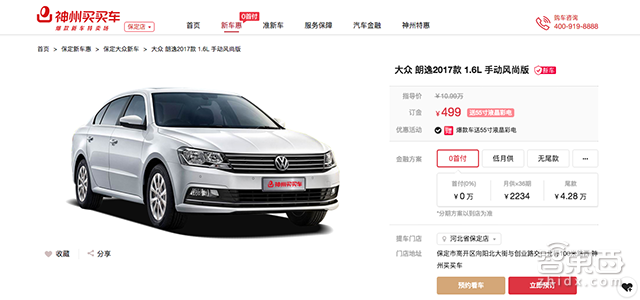 车东西去其天猫店与官网查看了具体的分期介绍,以指导价10万9900的朗逸1.6 手动风尚型为例,在神州买买车购车的总费用约为12.3万元。而神州买买车在介绍页面则宣称4S店分期购车的总金额约为13.6万元。按照这个粗略的对比来看,在神州买买车贷款购车要比4S店便宜1.3万元。