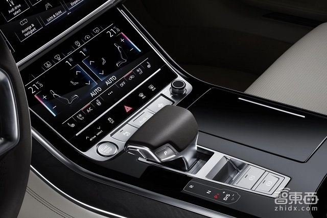 再看其它地方,主要被超大的中央控制器占据了,奥迪安装了2块超清晰高对比度屏幕。两块屏幕全都支持触觉反馈功能,可以给人一种按压物理按钮的感觉,正如iPhone 7 Home按钮一样,虽然不能100%模拟物理按钮,但是比之前看到的好。