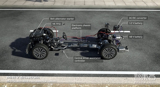 在自动驾驶系统之外,奥迪A8还有另外一个领先,即它是全球第一批搭载48V轻混系统(Mild Hybird)的乘用车。