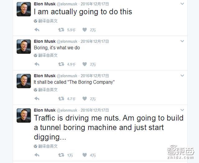 在一个小时内,这个项目就有了名字和一个公司,“它叫钻孔公司(The Boring Company,如果你喜欢,也可以叫它“无聊公司”,boring有无聊的意思。)”他写道,“钻孔,打洞,这就是我们要做的”。两个小时过去,马斯克又发了推特“我真的要这么干了。”