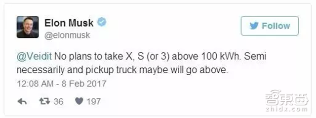 今年二月份,马斯克还在推特上发文称“特斯拉Model S和Mode X(当然包括Model 3)的电池不会达到100KWh,但可以告诉你们的是,Semi将有可能拥有超过100KWh的超大容量电池。”