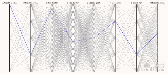 Waymo管这个过程叫作“fuzzing”。以四向停车点为例,总共会生成800个场景。系统制作一张漂亮的图表,工程师可以进去查看,看看不同的变量组合与汽车挑选的路线有何关联。